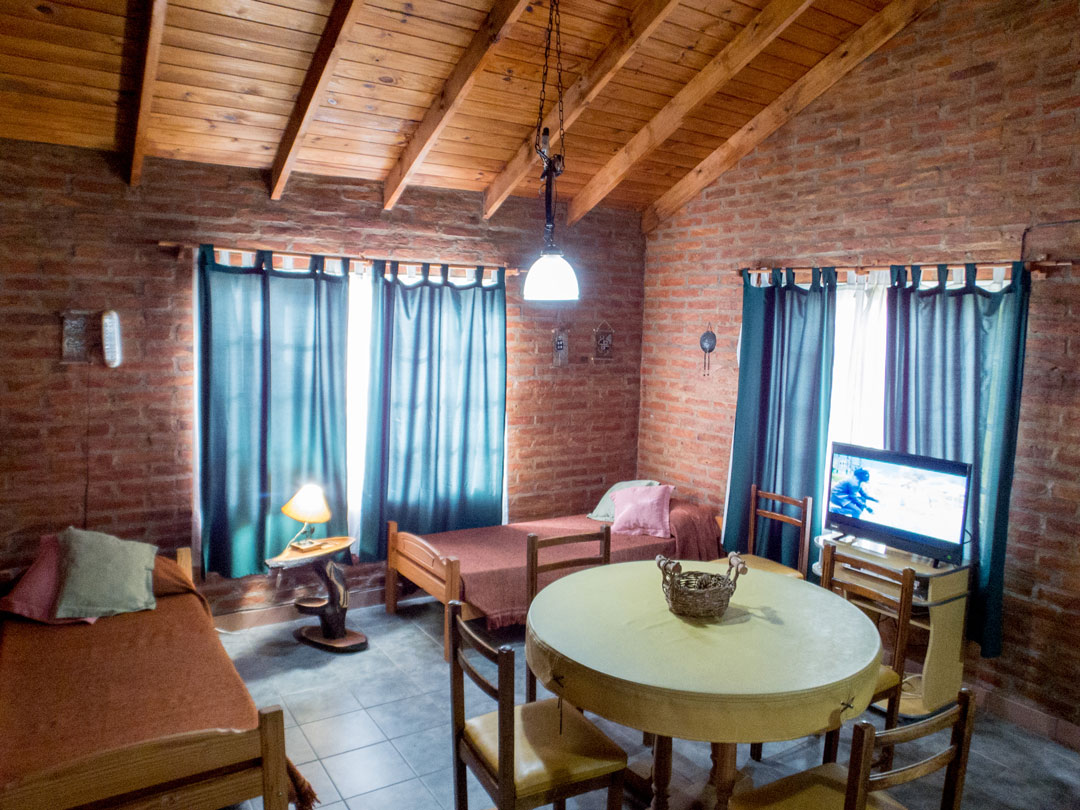 Distribución de las cabañas: Una habitación con cama matrimonial, una sala comedor con dos camas individuales. Ofrecemos servicio de practicuna para menores de 2 (dos) años (sábanas y frazadas incluídas), silla alta de comer y bañadera.